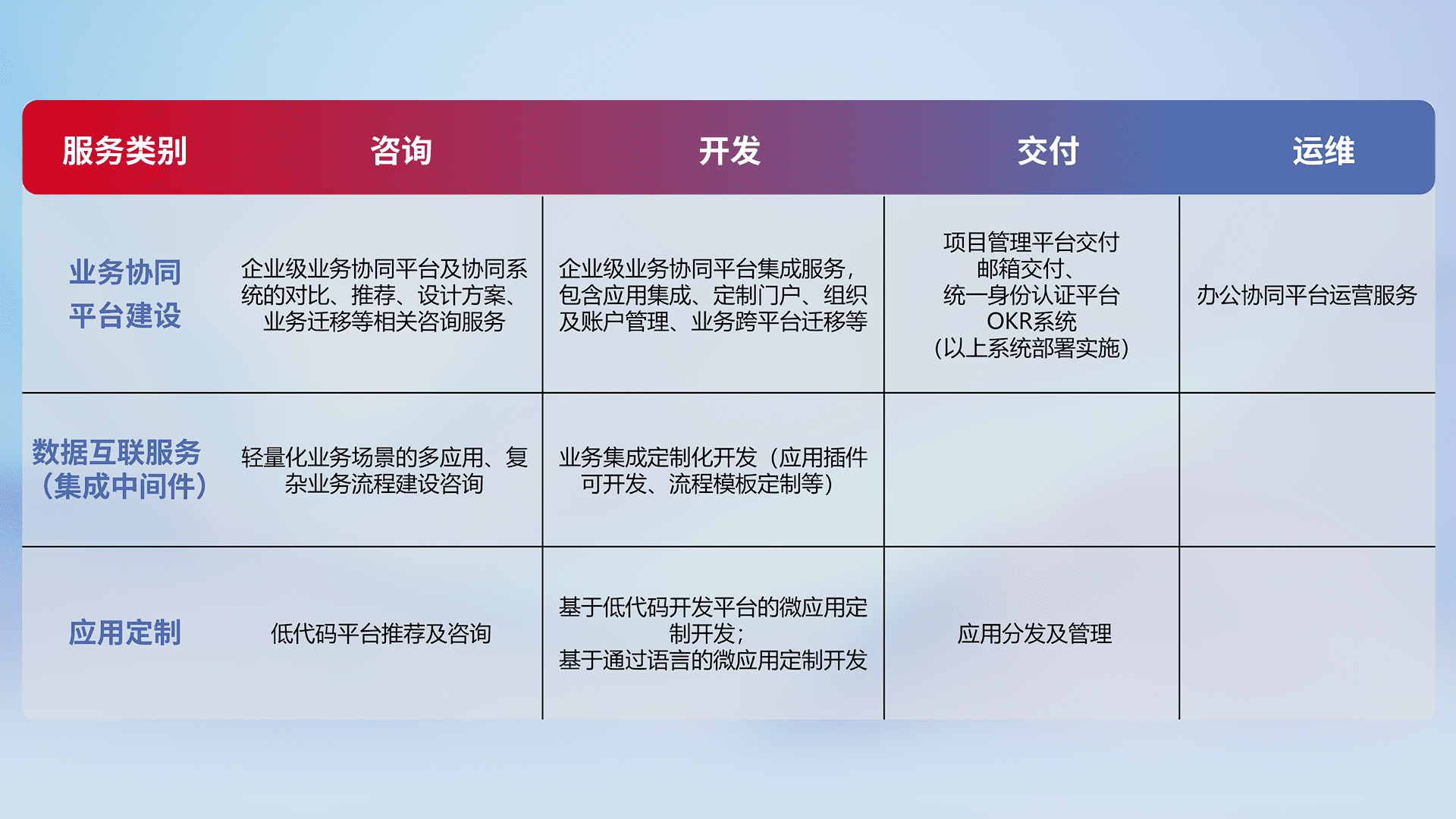 针对钉钉、、企微、、、IDaas等平台级产品提供产品的规划、、、、方案、、交付、、定制化开发等服务,,实现如统一协同办公、、、智能客户服务、、、混合会议管理、、、智能数据查询、、等业务场景,,,,实现数字化转型。。